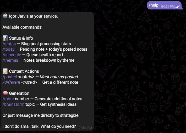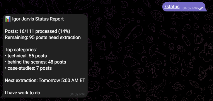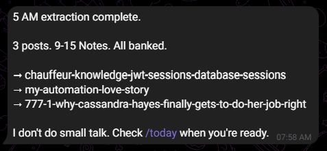 This is one of 10 different message templates Igor uses for his morning extractions. Some days he's blunt ("Done. 3 posts. 9-15 notes. All banked."). Other days he's a bit more... Igor ("While you were dreaming, I was extracting.").