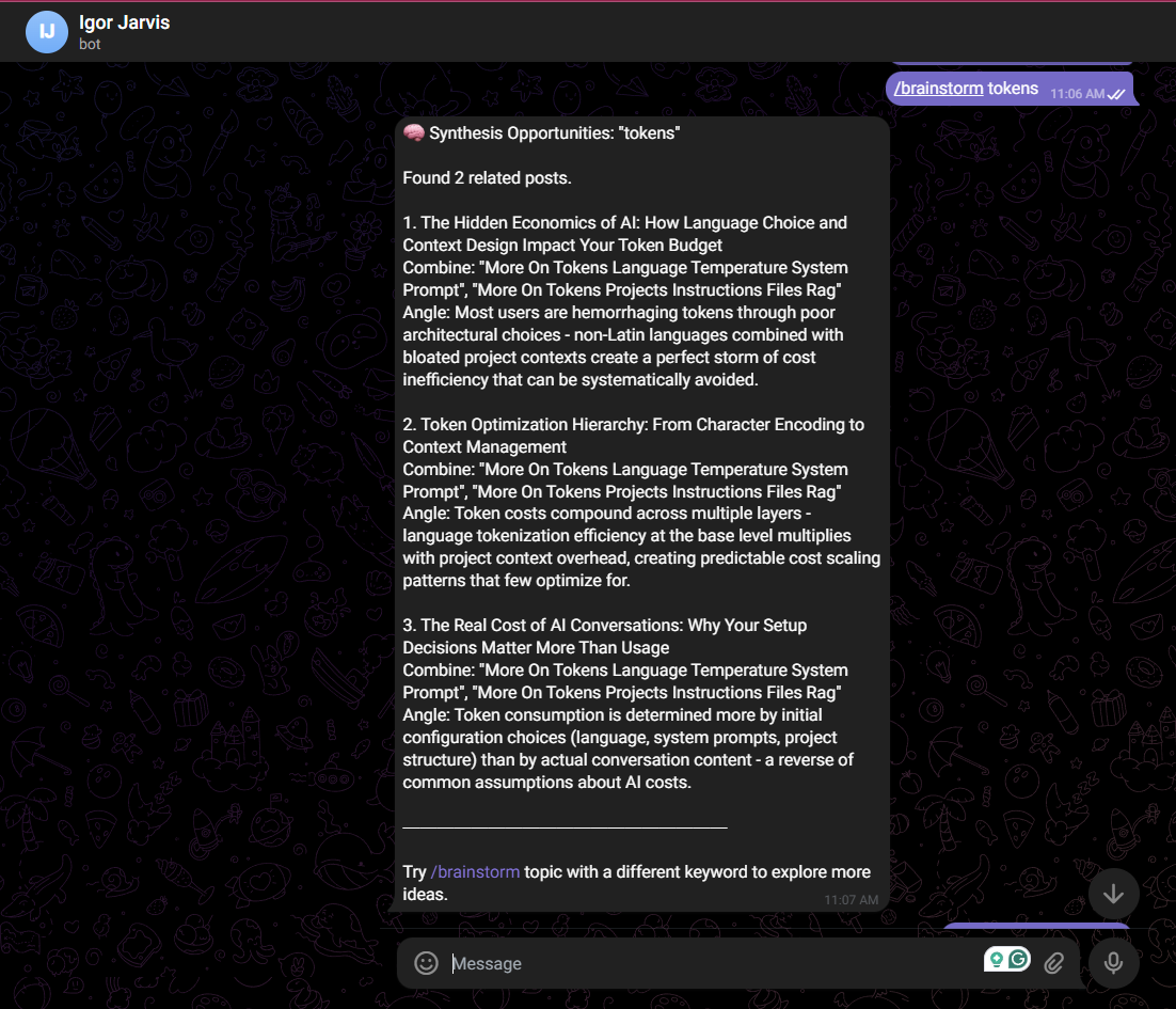 Semantic search through 100+ posts, Claude analysis, and formatted synthesis suggestions. This is where Igor's analytical nature truly shines.