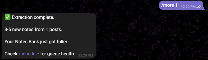 This extraction happens every 3 days automatically. Not daily, because that would create an overwhelming backlog of notes. The 3-day schedule keeps the Notes Bank healthy while the /more command lets me trigger additional extractions on demand whenever I want.