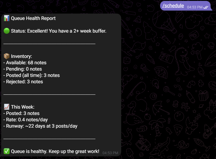 By Saturday, let's say I've been posting consistently and my Notes Bank is getting low. The runway calculation from /schedule shows I only have about 5 days of content left. I need more notes.