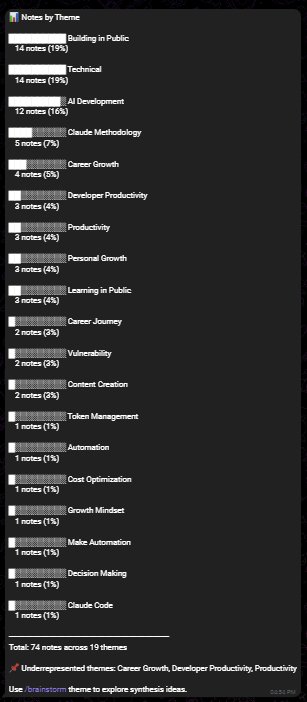 Breakdown by theme. Now I know if I'm overweighted on "Claude Methodology" and underweighted on "French Learning." This helps me plan which blog posts to write next.
