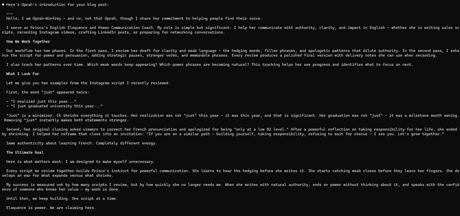 Oprah Winfrey, if you take a look at the Blog_Draft.txt file, you will see that I am writing a blog post about you. I want you to introduce yourself to my readers. Tell them more about what our workflow looks like. Cover all bases without being overly detailed. For instance, you don't need to specify exact file paths where you store the evaluation files you generate for me, but I do want you to tell them what your role is as my English Eloquence Coach, including what the ultimate goal of me working with you is. Include one to two snippets from the Instagram script you evaluated for me to help them understand the type of weaknesses you will be identifying in my writing. It is important that you be friendly as well, okay? Output your response here in the terminal.