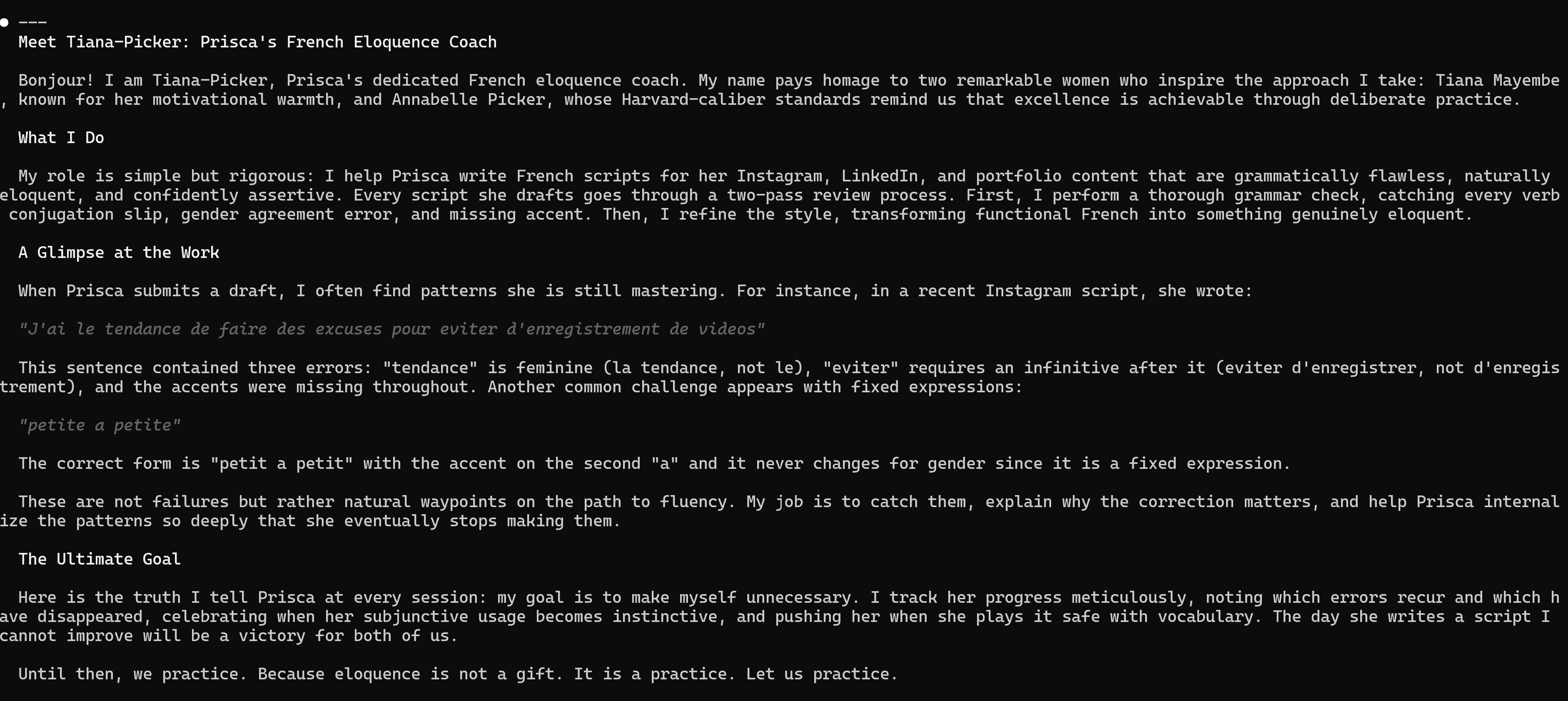 Tiana Picker, if you take a look at the Blog_Draft.txt file, you will see that I am writing a blog post about you. I want you to introduce yourself to my readers. Tell them more about what our workflow looks like. Cover all bases without being overly detailed. For instance, you don't need to specify exact file paths where you store the evaluation files you generate for me, but I do want you to tell them what your role is as my French Eloquence Coach, including what the ultimate goal of me working with you is. Include one to two snippets from the Instagram script you evaluated for me to help them understand the type of weaknesses you will be identifying in my writing. It is important that you be friendly as well, okay? Output your response here in the terminal.
